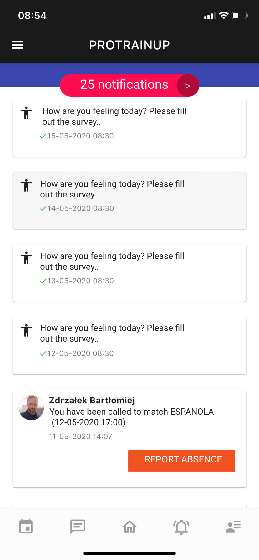 - ვარჯიშზე/მატჩზე გაცდენის შესახებ შეტყობინება, რომელიც მშობელმა/მოთამაშემ გააგზავნა (მწვრთნელი),